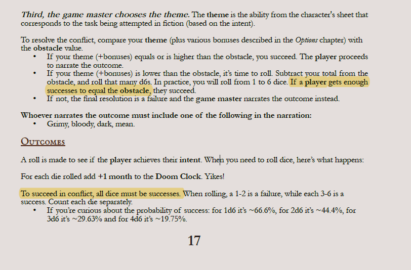 Sama mechanika opisana jest po macoszemu. Przynajmniej porównując z tym, jak gra traktuje strukturę. Mechanizm testów jest bardzo ciekawy i całkowicie nieintuicyjny jednocześnie. Po kolei jednak. Wysokie stopnie trudności zachęcają nas do tego, żeby nie rzucać a probować, zdobyć automatyczny sukces, możemy to osiągnąć poprzez poświęcanie różnych cech bohatera (trapping i background). Ma to sens i będzie fajnie popychać fabułę do przodu. Niestety, jeżeli zdecydujemy się rzucać, robimy to w bardzo nieintuicyjny sposób. Zgromadzoną pule odejmujemy od stopnia trudności i rzucamy tyloma kostkami. Na wszystkich musimy wyrzucić sukcesy. To jedyny znany mi system gdzie im mniejszą pulą rzucamy, tym lepiej. Na dodatek w opisie mechanizmu zaplątał się jakiś fragment chyba ze starej wersji, który karze nam po prostu liczyć sukcesy i porównywać ich ilość ze stopniem trudności — co sprawia, że gdyby grać RAW żadnego testu nie można by zdać.